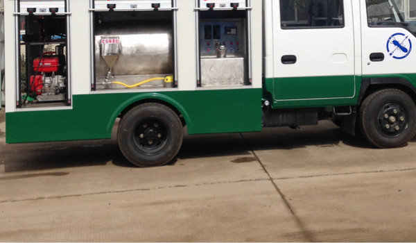 衛(wèi)生防疫車是一種可通過電腦來控制藥物的兌比濃度、并可自動灌裝,攪拌的新型白蟻防治車。其特點是此白蟻防治車上有配藥系統(tǒng),噴藥系統(tǒng),攪拌系統(tǒng)及清洗系統(tǒng)。此車上配有兩個罐體,采用上下疊加式連接,上部罐體為清水箱,下部罐體為配藥箱。在罐體前部另外配有單獨的藥箱(液體藥物),藥箱上部安裝電腦控制系統(tǒng),后部安裝加藥機,另在整車后部安裝有高壓泵及卷盤。配藥時只需按所需的比例在電腦上輸入所需要的加水量及加藥量即可自動配藥。當藥物通過加藥機輸入到配藥箱后,即可啟動車輛的攪拌系統(tǒng)。另外此車輛還單獨配有粉狀藥物灌裝到配藥箱的功能,只需將粉狀藥物倒入其單獨設(shè)置的投料口即可操作配藥。