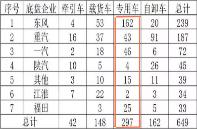 橫向比較幾款整車可以發(fā)現(xiàn),牽引、載貨、自卸大多為主機(jī)廠自己申報(bào),而國(guó)六專用車產(chǎn)品多為改裝廠申報(bào),所以是“兵家必爭(zhēng)之地”。