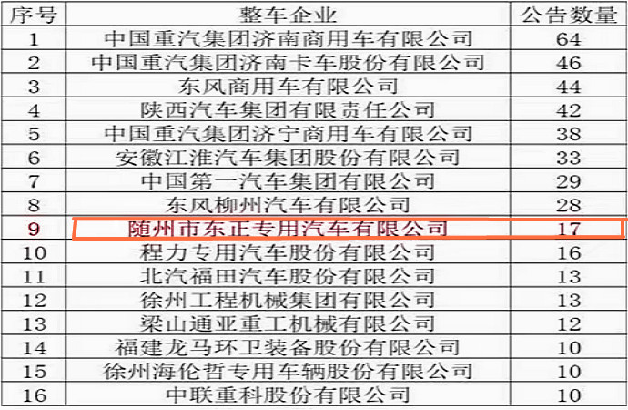 對(duì)于整車公告而言,本批國(guó)六重卡公告數(shù)量10個(gè)以上的企業(yè),共計(jì)16家,主機(jī)廠占據(jù)主流,重汽濟(jì)南商用車、重汽濟(jì)南卡車東風(fēng)商用車公司分列前三名。改裝廠中,隨州東正汽車排名靠前。