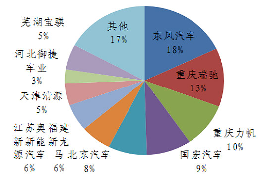 預計 8 月份新能源專用車有望進入補貼目錄,產量爆發(fā)在即。5 月 24 日工信部公布《道路機動車輛生產企業(yè)及產品公告》(第 285 批),公告包括了 218 款新能源車。此次車型公告中最受關注的是 103 款電動專用車,占新能源車型總數比為 47%,而電動專用車中,電動物流車占比 80%以上。2016 年 6 月 23 日工信部公示《道路機動車輛生產企業(yè)及產品公告》(第 286 批),包括了 396 款新能源車型,其中新能源專用車155 款。因此,預計 8、9 月份第四批《新能源汽車推廣應用推薦車型目錄》將出現新能源專用車車型。從 2016 年年初至今,多家電動物流車公司訂單數已經超過 10.32萬輛,一旦新能源物流車進入補貼目錄,電動物流車將爆發(fā)增長。其中,東風汽車在純電動汽車車型申報、市場占有率及訂單數量均遙遙領先。